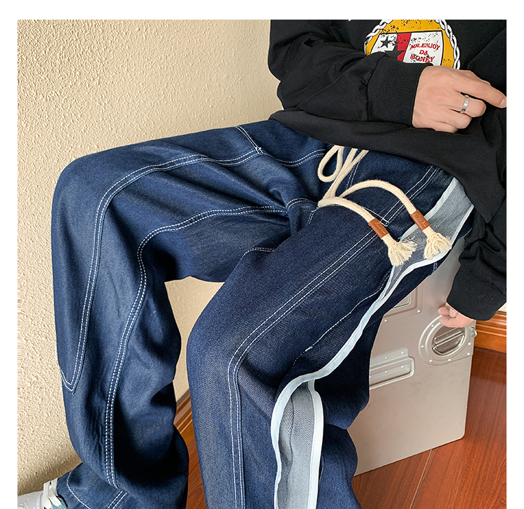 褲型:寬鬆型特殊工藝:水洗褲長:長褲腰型:中腰褲門襟:繫繩閉襟適用場景:日常款式細節:撞色彈力:微彈褲腳口款式:直筒工藝:免燙處理洗水工藝:水洗產品類別:牛仔褲