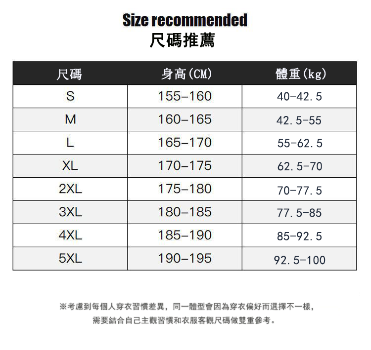 | 5XL | 80 | 68.5 | 156 | 106 | 160 |