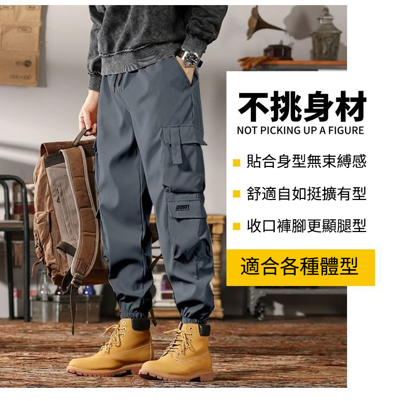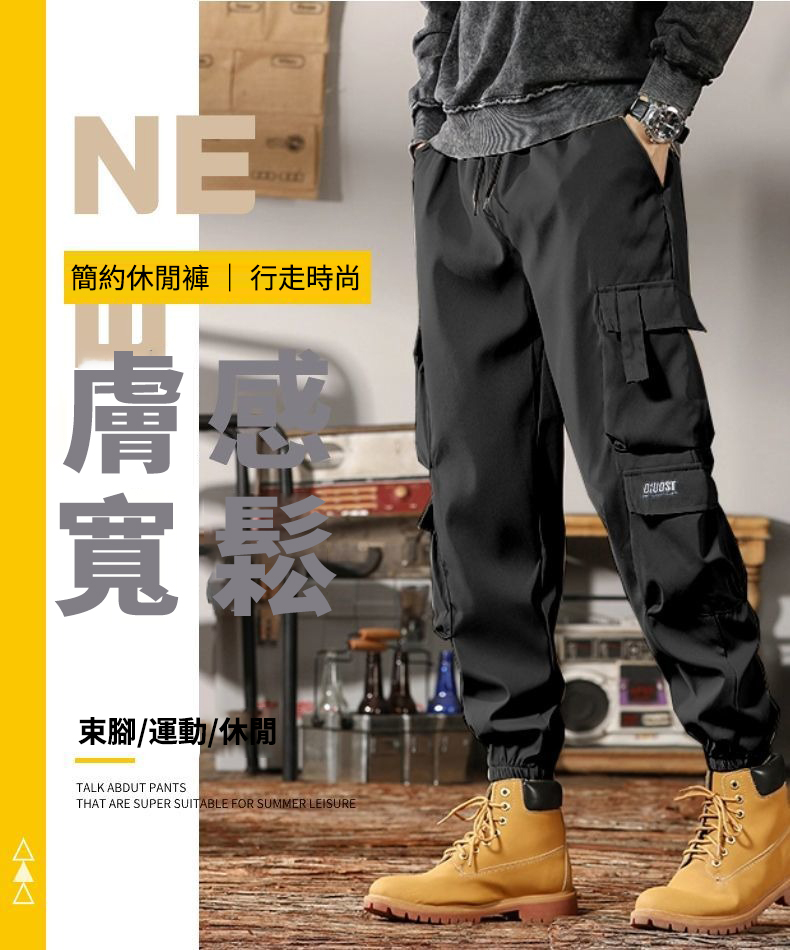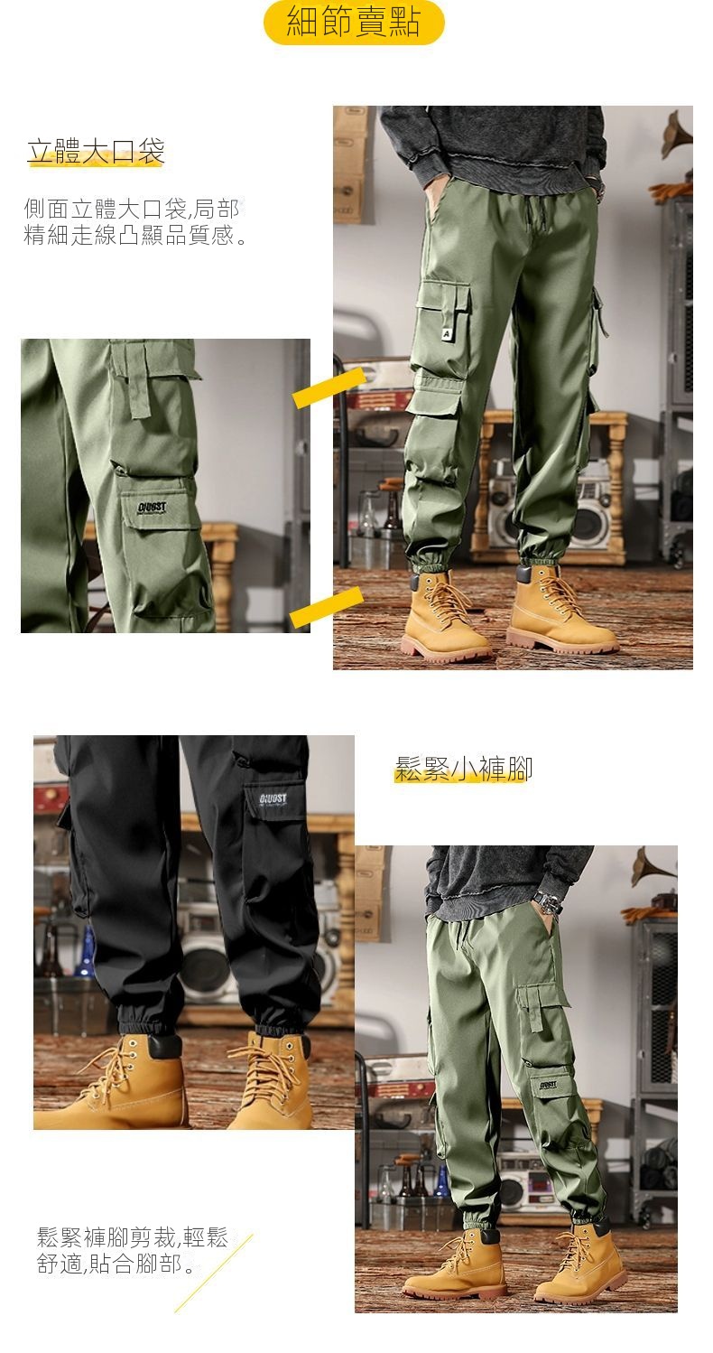 流行元素:口袋,腰部抽繩,束脚