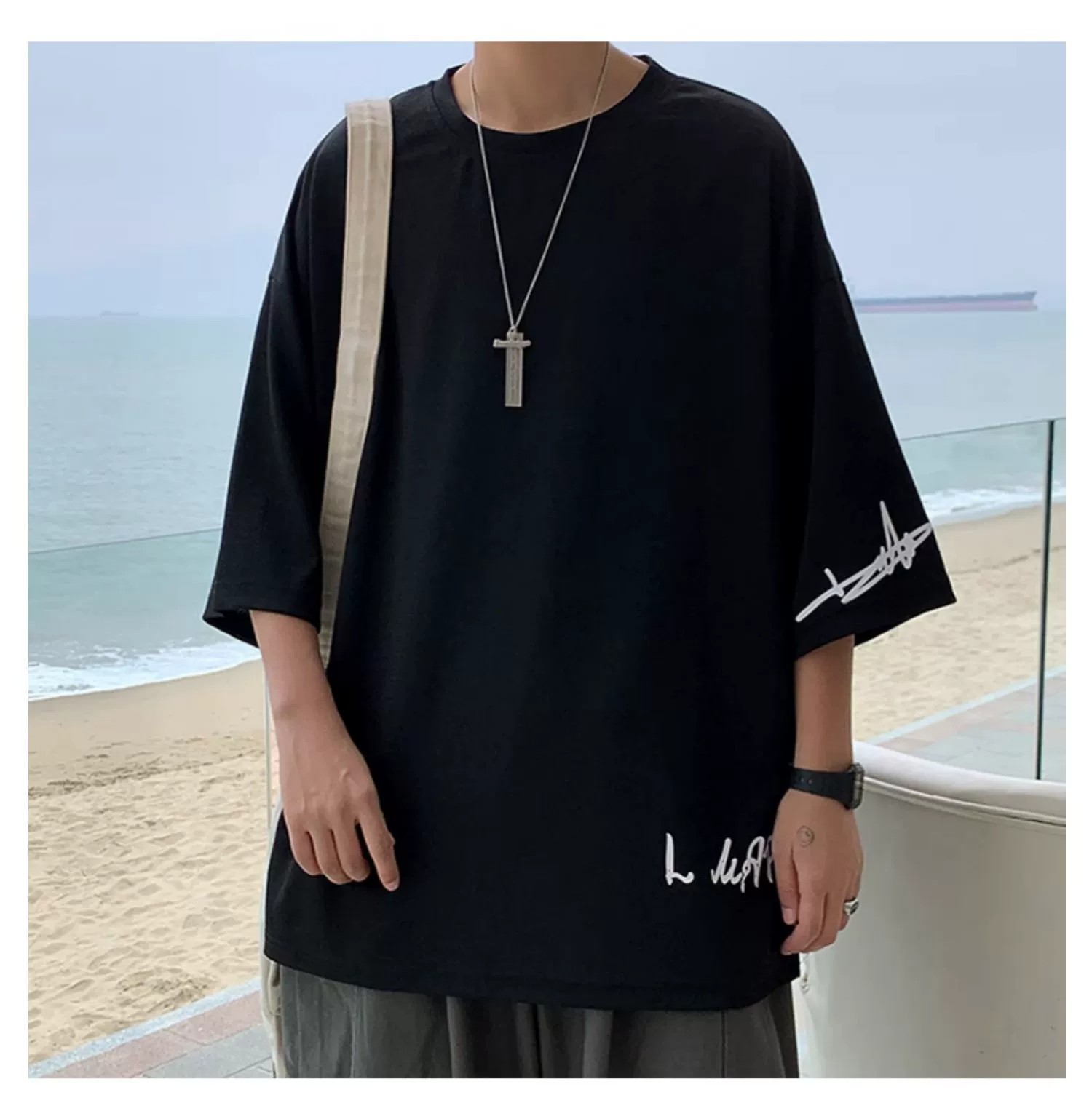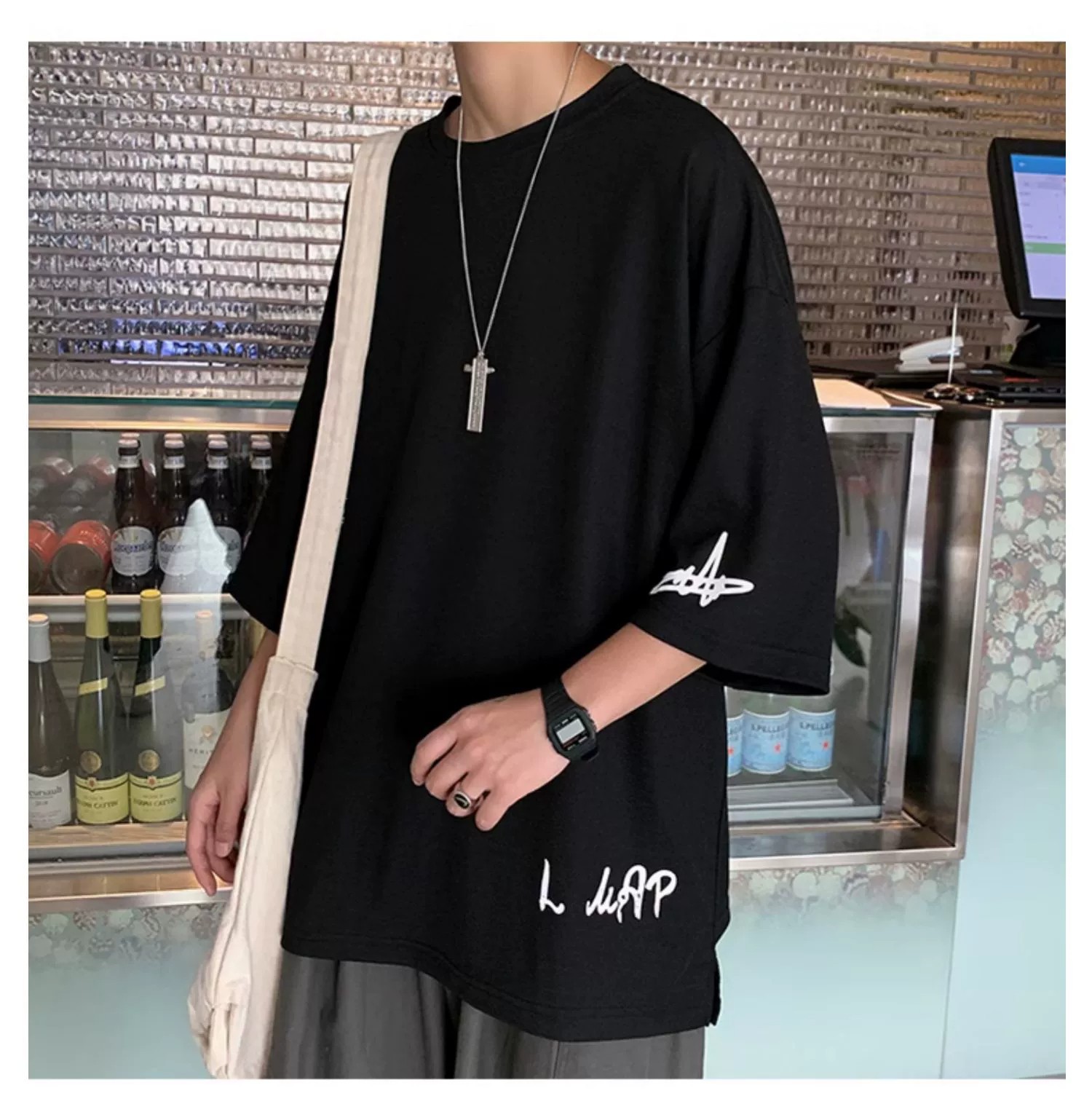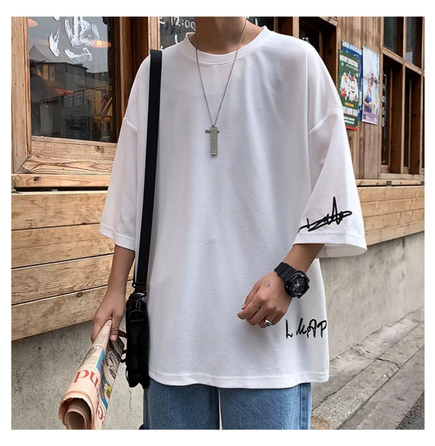 【領型】圓領【圖案】字母【厚薄】薄款【款式】套頭【袖長】七分袖【袖型】落肩袖【版型】寬鬆型【風格】港風